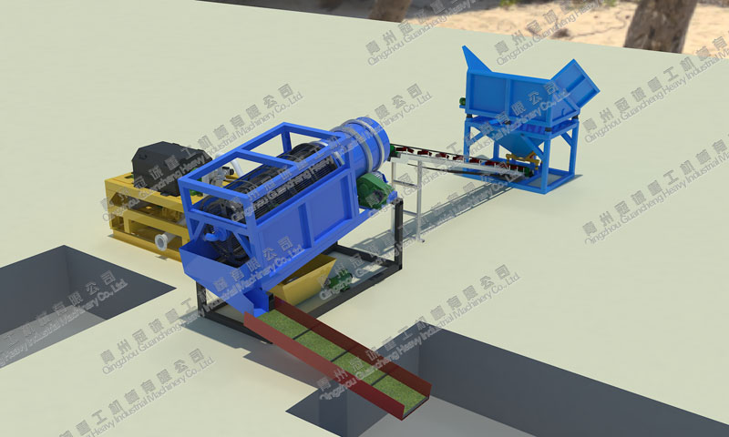 原料通過工程車輛送入振動料倉,通過底部振動給料機均勻給入上料輸送機,然后進入多鉸刀絞洗篩內進行篩選分級為:粗料與細料兩種規格,其中粗料排入一條固定式淘金氈溜槽內進行收尾,廢料排入廢料池中;